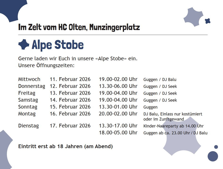 Mitglieder, Freunde, Bekannte und zahlreiche weitere Helferinnen und Helfer des Hockeyclubs Olten freuen sich auf Euren Besuch in unserer ALPE STOBE…🤍💙💃🏻🕺🏻🥂🍻